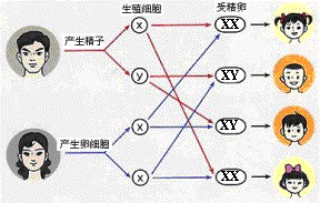 ②男性性染体是异型染色体XY,在形成配子时,产生两种精子X和Y,两者比例X.Y=1︰1;女性性染色体是XX,在形形成配子时只产生一种卵细胞X,X精子与卵细胞结合的受精卵XX发育成女孩,Y精子与卵细胞结合的受精卵发育成男孩XY。所以XX︰XY=1︰1,生男生女机会均等。如下图表示: