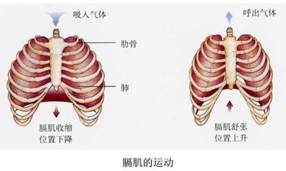 吸气:膈肌、肋骨间的肌肉收缩→胸腔容积扩大→肺扩张→肺内气压缩小→吸气。
