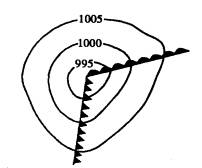(三)锋面气旋 锋面气旋是由冷暖空气共同组成的具有锋面的气旋,它主要活动在中纬度地区,更多见于温带地区,因而也称为温带气旋。锋面气旋的平面结构,对北半球而言,是一个逆时针方向旋转的旋涡,中心气压最低,自中心向前方延伸一条暖锋,向后方伸出一条冷锋。