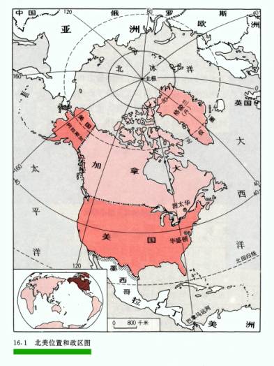 1.位置和范围:美洲北部,北临北冰洋,西临太平洋,东临大西洋。