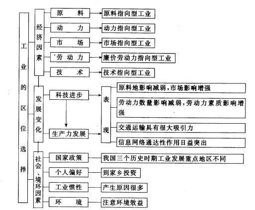 (2)了解工业区位因素可能发生的变化。a.原材料、燃料方面:资源的使用年限,替代材料或新资源的变化,可能造成原材料、燃料指向减弱,市场指向加强。b.交通运输条件方面:可能对运费、市场区位产生影响,在交通枢纽如铁路、公路、河港、海港等地出现新兴工业城市。c.劳动工资水平方面:可能随经济发展而变化,因而导致一些廉价劳动力指向型工业必须寻找并转移到新的区位。d.科技方面:科技条件和劳动力素质对一些跨国公司的企业扩展、区位选择的影响越来越大。e.信息通达性、工业集聚程度也成为影响众多企业区位选择的因素。