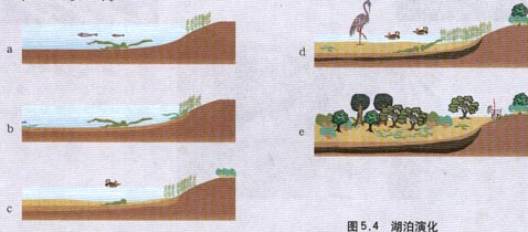 以湖泊的演化为例,经过a-b-c-d-e五个阶段的演化,地形、气候、生物、土壤和水文均发生了变化:地形由湖泊变成了陆地,气候由湿润变得干燥,生物由水生生物变成了陆地生物,土壤逐渐由湿变干,水面逐渐缩小直至消失。