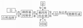 解题分析:①表示突变和基因重组,即基因突变、基因重组和染色体变异,为生物进化提供原材料,A错误;生殖隔离是指不同物种之间一般是不能相互交配的,即使交配成功,也不能产生可育后代,C错误;自然选择导致种群基因频率定向改变,使生物朝一定的方向进化,但生殖隔离的出现才会导致新物种形成,D错误。