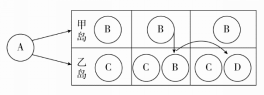 6.如图是加拉帕戈斯群岛上物种演化的模型:图中上半部分为甲岛的物种演化模型,下半部分为乙岛的物种演化模型,A、B、C、D为四个物种及其演化关系。请看图回答问题:
