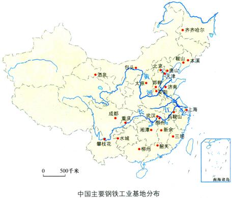 钢铁工业:我国钢铁工业主要分布在东部和中部地区。主要钢铁工业基地有沿海的鞍山和本溪、京津唐和上海,长江沿岸的马鞍山、武汉、重庆、攀枝花等。