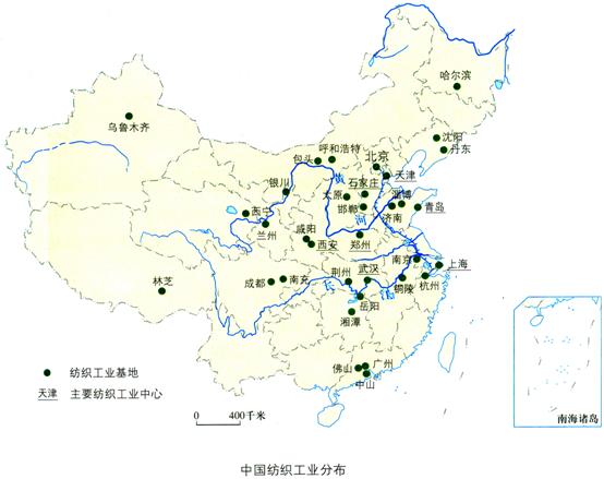 纺织工业:我国纺织工业主要分布在东部人口较多、农业发达的地区。上海、天津、青岛、石家庄、郑州、西安、武汉是全国棉纺织工业基地。