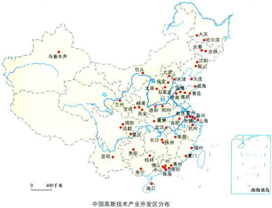 四大高新技术密集区,即以北京中关村科技园为中心的环渤海高新技术产业密集区,以上海高新区为中心的沿长江高新技术产业密集区,以深圳高新区为中心的东南沿海高新技术产业密集区,以西安—杨凌高新区为中心的沿亚欧大陆桥高新技术产业密集区。