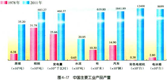 新中国成立以来,中国工业得到了很大发展。许多工业产品产量增长迅速,产量在世界上名列前茅,其中煤炭、钢铁、水泥、发电量、棉布、汽车、电视机、电冰箱等的产量居世界首位。