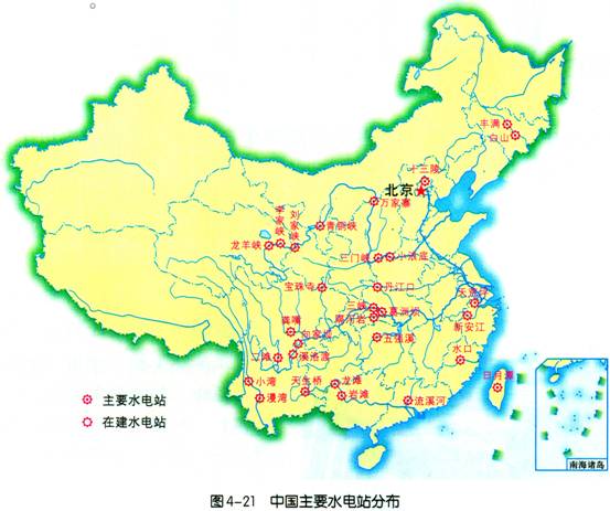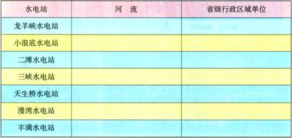 水力是中国重要的能源,目前水力发电量要占到全国总发电量的17%左右。中国水力发电主要集中在水能资源丰富的长江、黄河、珠江、澜沧江、松花江的上游。读图4—21,找出表格中的水电站,看一看这些水电站分别位于哪一条河流上,分布在哪一个省级行政区域单位。