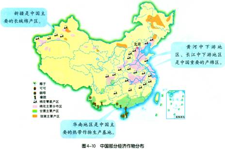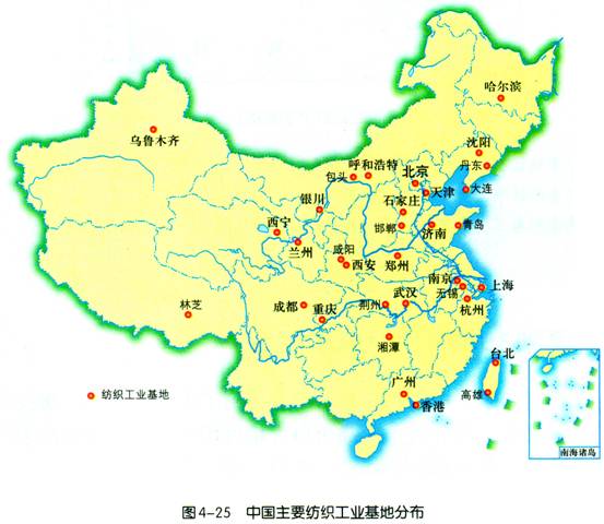 1、读图4—25,结合图4—10,说一说中国主要棉纺织工业基地的分布特点。