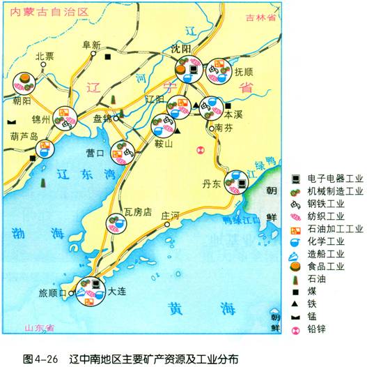 (3)辽中南地区丰富的煤、铁、石油等资源,为发展钢铁、机械、造船、石油加工、化学等重工业提供了有利条件。
