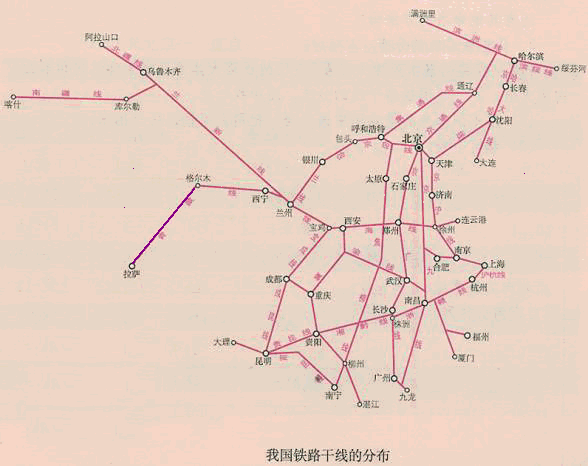 滨洲——滨绥线(满洲里——哈尔滨——绥芬河),哈大线(哈尔滨——大连),南昆线(南宁——昆明),大秦线(大同——秦皇岛),北疆线(乌鲁木齐——阿拉山口),南疆线(吐鲁番——喀什),青藏线(西宁——拉萨)。