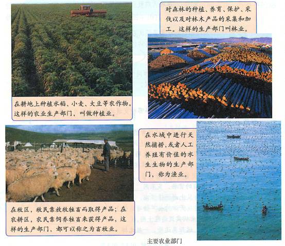 1、农业:利用动物、植物等生物的生长发育规律,通过人工培育来获得产品的各部门,统称为农业。