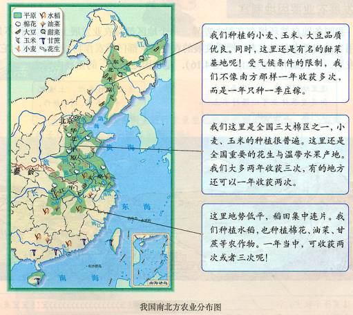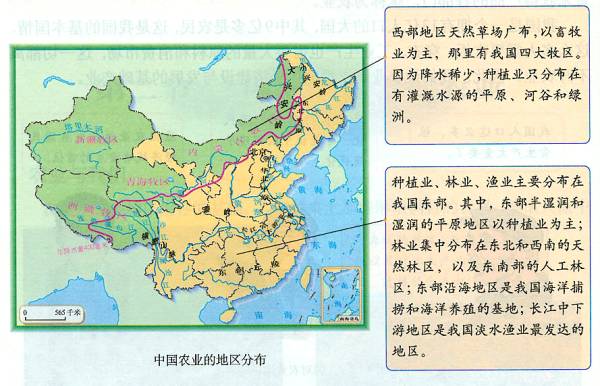 3、农业的地区分布:我国东部与西部、南方与北方的差异很明显。