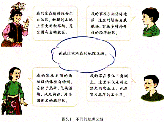 上图通过四个人物分别描述自己生活地理区域的显著特征,形象直观地说明地理区域的差异性。