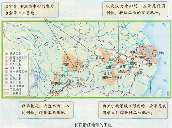 ①钢铁工业走廊:沿江地带有上海宝山、安徽马鞍山、湖北武汉、重庆、四川攀枝花等钢铁工业基地;