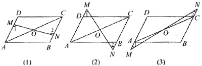要寻求∠1与∠2的关系,从直观上先判断出∠1=∠2,然后再说明结论成立的理由.由图形可知它们分别在两个三角形中,所以可以通过全等三角形来说明;另外,∠1,∠2正好是MN截AD、BC得到的一对内错角,因而可从AD∥BC来说理.比较(2)、(3)与(1)的关系,图形的位置变了,仔细观察,什么发生变化,什么没有发生变化?可知∠1仍然等于∠2,因为AD与BC的平行关系始终没有改变.