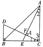 例3、如图所示,在△ABC中,∠ACB=90°,AC=BC,AE是BC边的中线,过C作CF⊥AE,垂足为F,过B作BD⊥BC交CF的延长线于D.