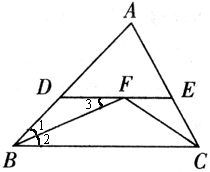 例4、如图所示,∠ABC和∠ACB的平分线相交于F.过F作DE//BC,交AB于D,交AC于E.求证:BD+EC=DE.