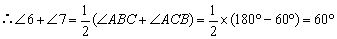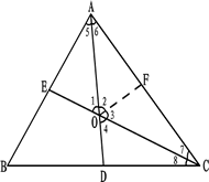 解:在AC上截取AF=AE,连结OF. 在△AEO和△AFO中 ∴△AEO≌△AFO ∴∠1=∠2 又∵ ∠B=60° ∴∠2+∠3=180°-60°=120° ∴∠1=180°-120°=60° ∴∠2=∠1=60° ∴∠3=120°-60°=60° 又∵∠4=∠1,∠4=∠3=60° 在Rt△CDO和△CFO中 ∴△CDO≌△CFO ∴CD=CF 又∵AC=AF+CF ∴AE+CD=AC.