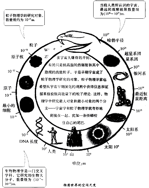 世界上最高的山峰珠穆朗玛峰的海拔高度为8848m,我国最长的河流长江长约6400km,组成物质的分子、原子的直径约为10-9m,下图所示为物质世界的空间尺度,从10-15m到(1026~1027)m,共跨越了42~43个数量级。