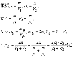 解析:多年来各省市中考中关于证明题是不多见的。本题证明的关键是抓住等量关系进行演绎推导,其中有两个等量关系应注意:(1)合金的质量等于两种金属质量之和;(2)合金的体积等于两种金属体积之和,具体求证过程如下。