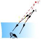 如图所示,水中物体A处的光线,由水中进入空气时在水面处发生折射,折射角大于入射角,折射光线呈发散状态,人眼根据光沿直线传播的经验逆着折射光线看去,觉得光线好像是从折射光线的反向延长线的交点A′点射来的,人眼看到的是A′点,A′点在A点的上方.所以,从空气中看水中的物体,光从水斜射进入空气,眼睛看到的是由于光的折射所形成的物体的虚像,虚像在物体的上方,即看到的物体位置比物体实际位置浅。