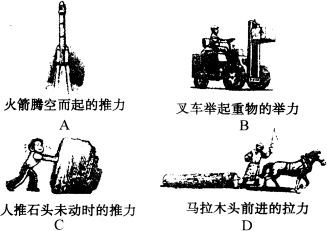 对照做功的两个必要因素逐项分析:A中火箭向上的推力使火箭升空;B中叉车向上的举力使重物上升;C中人对石头用力,但没有移动距离;D中马对木头施力且在拉力的方向上使木头前进。所以C中的情景力对物体没有做功。