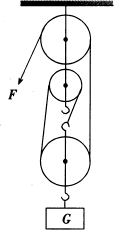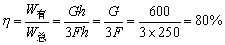 例4、如图所示,将重物G提高1m,拉力做功600J,如不计摩擦及动滑轮重,求重物G的物重是多少?如果实际拉力是250N,求该滑轮组的机械效率是多少?