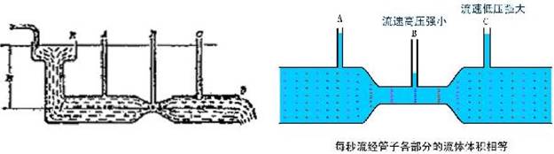 相同时间里流过A、B、C三处的水量相等,而在B处水管较细,所以在B处的流速一定比在A、C两处的流速大,压强小。由此可以得出一个结论:流体流动时,流速大的地方压强小,流速小的地方压强大。