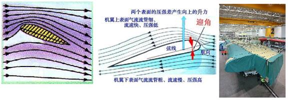 空气的流动在日常生活中是看不见的,但低速气流的流动却与水流有较大的相似性。日常的生活经验告诉我们,当水流以一个相对稳定的流量流过河床时,在河面较宽的地方流速慢,在河面较窄的地方流速快。流过机翼的气流与河床中的流水类似,由于机翼一般是不对称的,上表面比较凸,而下表面比较平,呈流线型。流过机翼上表面的气流就类似于较窄地方的流水,流速较快,而流过机翼下表面的气流正好相反,类似于较宽地方的流水,流速较上表面的气流慢。
