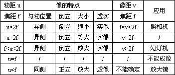 (4)凸透镜成像可以概括为二点三区域,即2f是成像放大与缩小的分界点,f是成实像与虚像的分界点。在u>2f区域,成缩小实像,在f<u<2f区域,成放大实像,在u<f区域,成放大虚像。