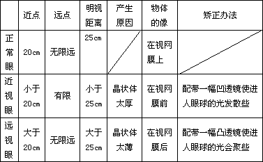4、列表比较正常眼与近视眼、远视眼