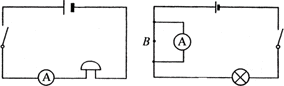 (1)电流表的连接方法:将电流表串联在电路中,即要测量哪个元件中的电流强度,就将电流表与这个元件串联;要测电路中哪一点的电流强度,就将电流串接在这一点。这样连接的原理是:串联电路中电流强度处处相等。例如,图甲中,电流表与电铃是串联的,通过电流表的电流强度与通过电铃的电流相等,电流表的示数就是通过电铃的电流强度,而图乙中,为了测量通过导线上B点的电流强度,将电流表与B点并联就不对了,因为通过B点的电流强度与通过电流表的电流强度不相等,电流表的示数不是通过B点的电流强度,正确的接法是将电流表串入B点。当然,在实际操作时,不必将导线从B点剪断,只要将这段导线的一端拆下,将电流表串入即可。