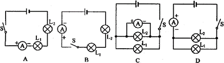 例1、在下图所示电路图中,为了测量通过灯泡L2中的电流强度,电流表的连接正确的是( )