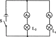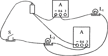 依题意,用一个电流表A1与灯泡L1串联成一条支路,另一个电流表A2与灯泡L2串联成另一支路,两条支路并联,通过开关S接到电源上,电路图如图所示。根据两灯泡的电流强度估计值,测量L1的电流表应选用0.6A量程,测L2的电流表应选用3A量程,并注意到电流表的+、-接线柱,实物连接如题图所示。根据干路中的电流等于各支路电流之和的关系,两电流表的读数之和即为通过电源的电流大小。