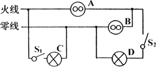 电灯C、D分别与控制电键S1、S2串联后,再并联在火线与地线之间,没有接错。插座B并联在火线与地线之间,也没接错,插座A串联在火线中,不插用电器时,在火线上发生断路,使B、D不能工作;插入用电器时,将使B、D不能获得220V电压而不能正常工作,所以插座A接错了。