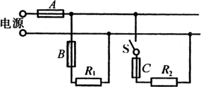 例6、如图所示,A是一根5A的保险丝,B、C都是3A的保险丝,R1=21Ω,R2=18Ω。电键S断开时,通过用电器R1的电流是2.4A,S闭合时,哪根保险丝将熔断?