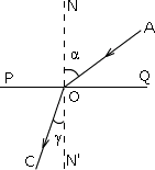 光在折射时遵循折射规律。在下图中,PQ表示空气和水的分界面,O点是一束光线的入射点,AO是入射光线,NN′是过O点的法线,∠AON叫做入射角,OC是进入水中传播的折射光线,折射光线跟法线之间的夹角∠CON′叫做折射角。