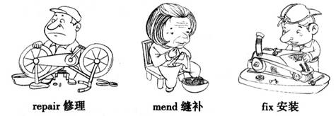 (1)repair比fix或mend正式,常用表示修补破损或有洞的东西。