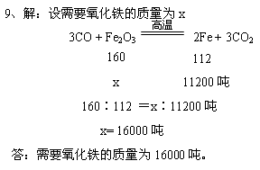 9、国家在建造水立方时用了含铁11200吨的钢材,若这些钢材是通过一氧化碳还原氧化铁得到的,则至少需要氧化铁的质量为多少吨?(反应的化学方程式为:3CO + Fe2O3 2Fe + 3CO2)