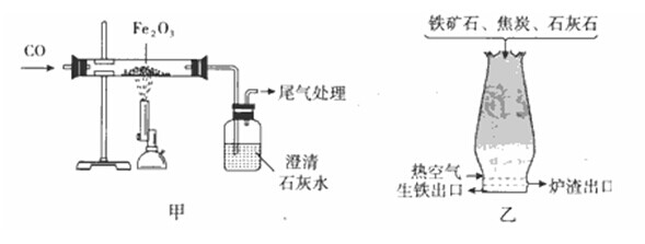 5、甲图是一氧化碳与氧化铁反应装置的示意图,乙图是高炉炼铁示意图。请回答下列问题。