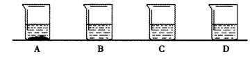 10、A、B、C、D四个烧杯中分别装有等量的水,在t℃时,向A、B、C烧杯中分别加入25g、15 g、5 g甲物质,向D烧杯中加入25 g乙物质,充分溶解后,静置,现象如图所示。