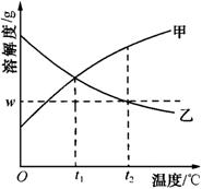 t1℃时,甲、乙的溶解度都大于w g,说明此时溶质的质量分数都为