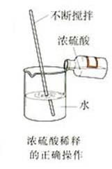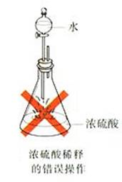 在稀释浓硫酸时,一定要把浓硫酸沿器壁慢慢注入水里,并不断搅拌。不可将水倒进浓硫酸里。