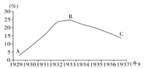 图片反映了1929~1937年美国失业人数占比的变化情况,促使B点到C点变化的直接有效措施是推行“以工代赈”。1929-1933年的经济危机冲击了美国的资本主义制度。罗斯福就任美国总统后实行了新政,为了解决就业问题,使大量失业者和穷人有工作,兴办公共工程,以工代赈。兴办公共工程吸引大量失业者,增加了就业机会,这些工程包括许多巨型堤坝和水库如田纳西水利工程,公共工程兴建,在客观上刺激了消费需求,扩大了内需,起到了一举多得的作用。故选A。