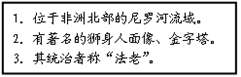 由题干中“金字塔、狮身人面像”判断是古代埃及的文明成就。金字塔是非洲尼罗河流域古埃及文明的代表作,是古代埃及国王“法老”的陵墓,是权力的象征,也是埃及人民的骄傲。狮身人面像,它是古埃及文明的标志之一,是人类文明的杰出成就。