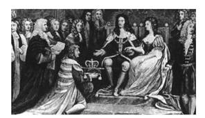 詹姆士二世上台后,在英国恢复天主教,实行封建专制统治,引起了英国国教和新兴资产阶级的反对。1688年6月,詹姆士二世生了一个儿子,这样,詹姆士二世信仰英国国教的女儿玛丽就失去了将来继承王位的可能,英国的资产阶级和新贵族想让玛丽继位的希望破灭。为了防止天主教徒将来可能继承王位,资产阶级和新贵族决定发动政变,推翻詹姆士二世的统治。英国议会出面邀请詹姆士二世的女婿、荷兰执政奥伦治亲王威廉来英国,以保护英国的国教、自由和财产。接到邀请后,威廉随即发表声明,要求恢复他的妻子玛丽的英国王位继承权。1688年11月1日,威廉率领一支1.5万人的军队和600艘舰船在英国西南海港托尔贝登陆,向伦敦挺进。詹姆士二世众叛亲离,仓皇逃往法国。1689年,英国议会宣布詹姆士二世逊位,威廉和玛丽共同管理英国,称威廉三世和玛丽二世。