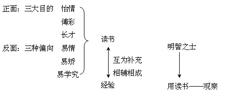 总结:先从正面说,读书有三种不同的目的:怡情、傅彩和长才。重点阐述读书的好处。而后从反面指出读书中的三种偏向,并论述读书和经验的关系:相互补充、相辅相成。最后指出只有明察事理的人才能够读书用书,而用书的智慧是在观察生活中得来的。
