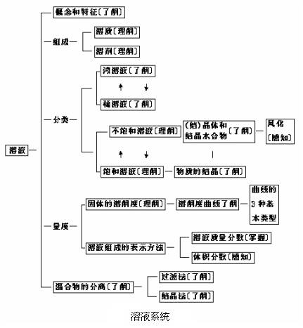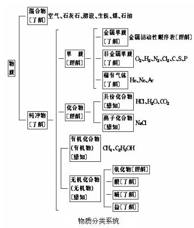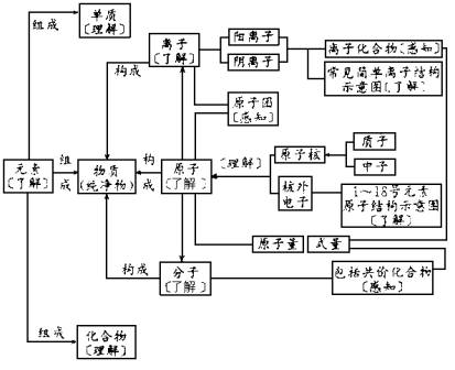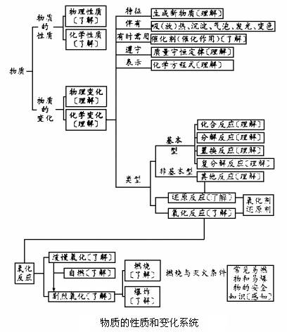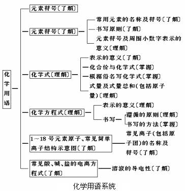 根据复习的内容和结构,化学基本概念和原理的复习可分为5部分:物质的组成和结构、物质的分类、物质的性质和变化、化学用语、溶液.这一部分绘制了知识结构图,并注明了按国家教委颁布的《九年义务教育全日制初级中学化学教学大纲(试用)》规定的教学要求的4个层次:感知(常识性介绍)、了解、理解、掌握,供同学们复习使用.